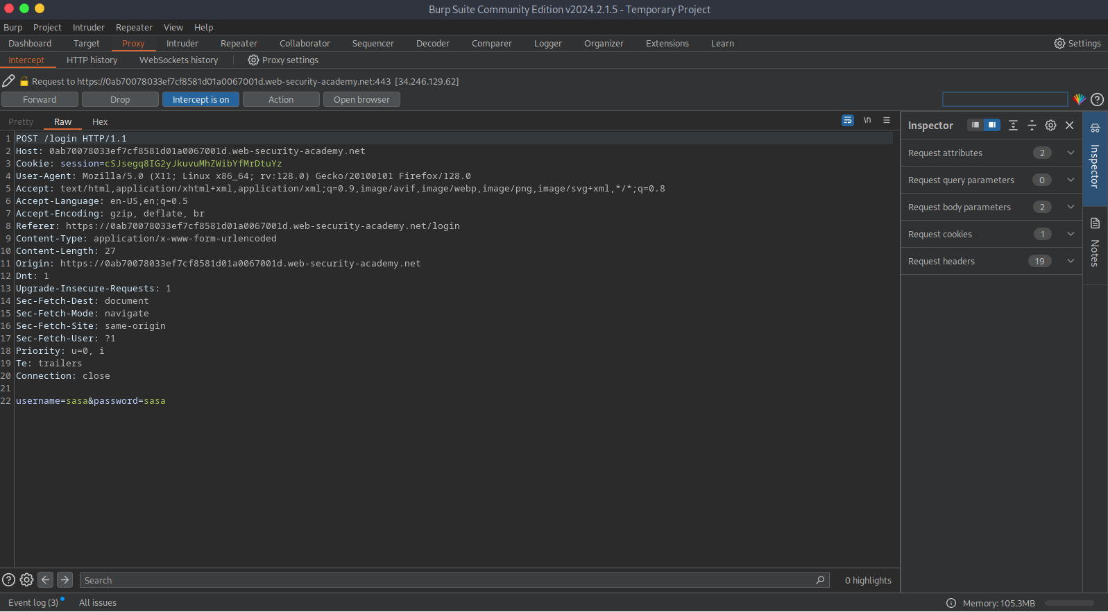After that, we open Burp Suite and ensure that ‘Intercept is on’ in the Proxy window. Now, our browser traffic is flowing through Burp Suite. Let’s send a test request with a username and password to our site.